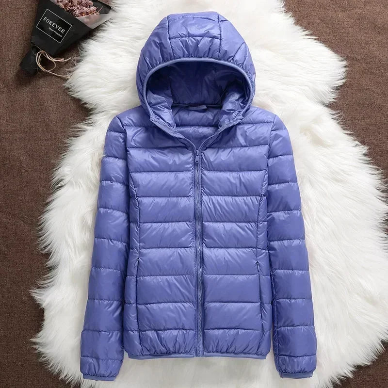Mulher usando jaqueta roxa em parque nevado
