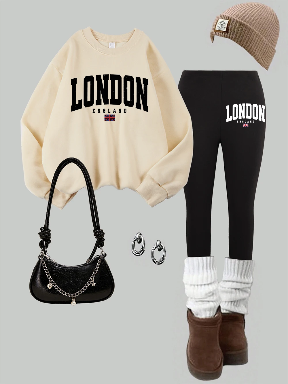 Embrace British style with this sophisticated two-piece set featuring iconic London England flag graphics. The premium fleece sweatshirt delivers exceptional warmth and comfort, while the coordinating thermal leggings provide a sleek, flattering fit. Perfect for casual outings or cozy winter days, this ensemble combines street-style appeal with functional design. The soft, durable fabric ensures lasting wear through multiple seasons. Ideal for those who appreciate bold fashion statements with practical comfort.