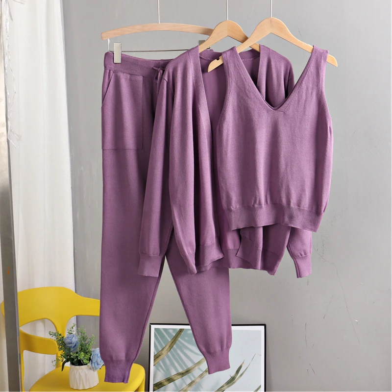 GIGOGOU Spring Autumn 3 Piece Women Cardigan Tracksuits combine contemporary style with practical comfort. This knitted ensemble features a coordinated cardigan, matching sweater, and pocket-detailed pants—ideal for transitional seasons. The soft, quality fabric drapes elegantly while maintaining shape, making it perfect for casual outings or relaxed workdays. The thoughtfully placed pockets add functionality without compromising the polished aesthetic. Layer the cardigan over the sweater for versatile styling options, or wear pieces separately to maximize your wardrobe potential. A sophisticated choice for women seeking effortless, put-together looks.